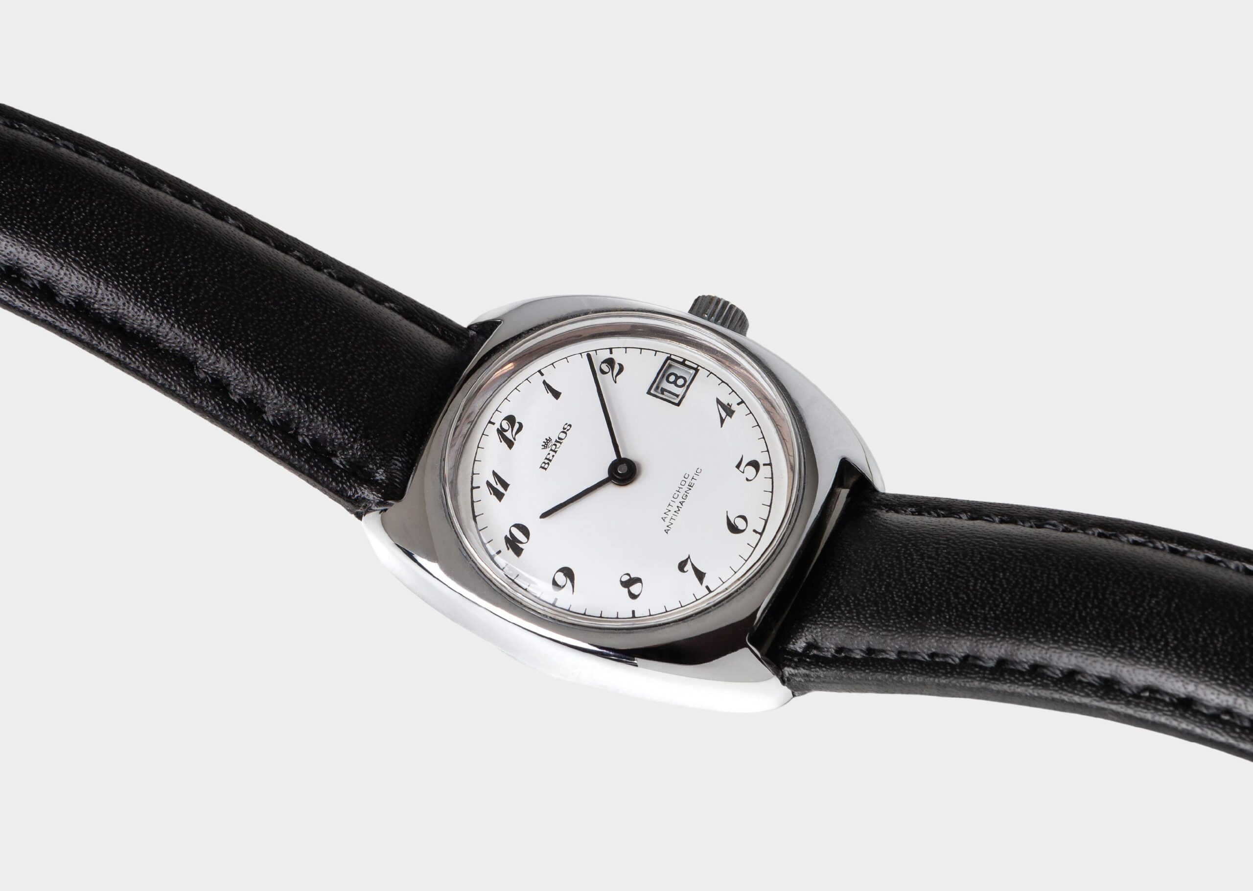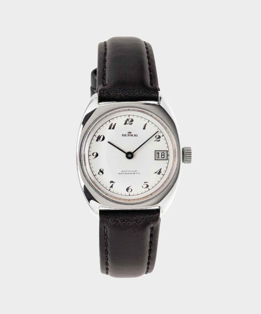 Classic è un orologio Berios Vintage Watch meccanico da uomo, con cassa tonneau in acciaio da 31×31 mm. Dotato di sistema Incabloc, quadrante bianco con numeri neri e datario, unisce eleganza classica e affidabilità meccanica.