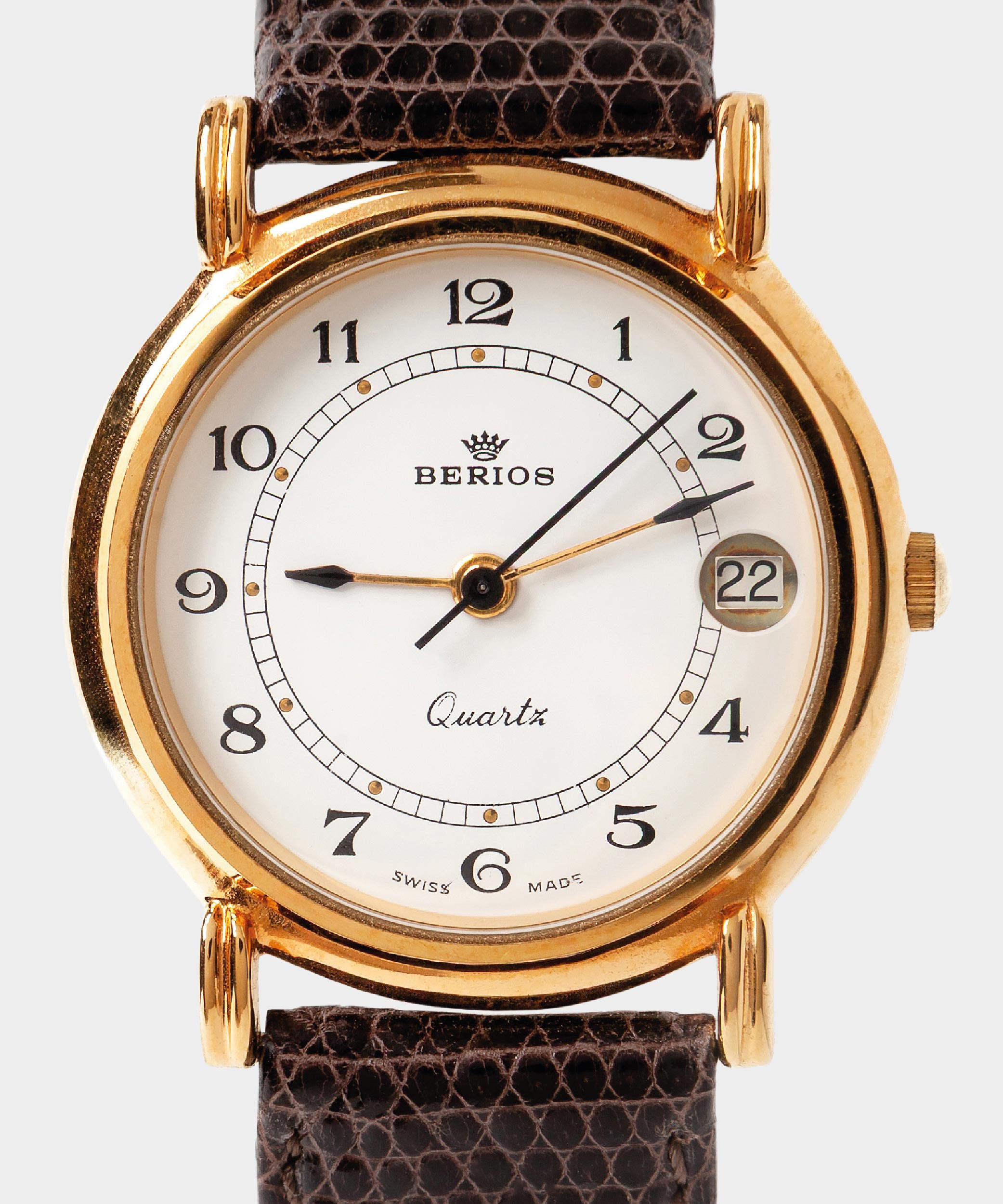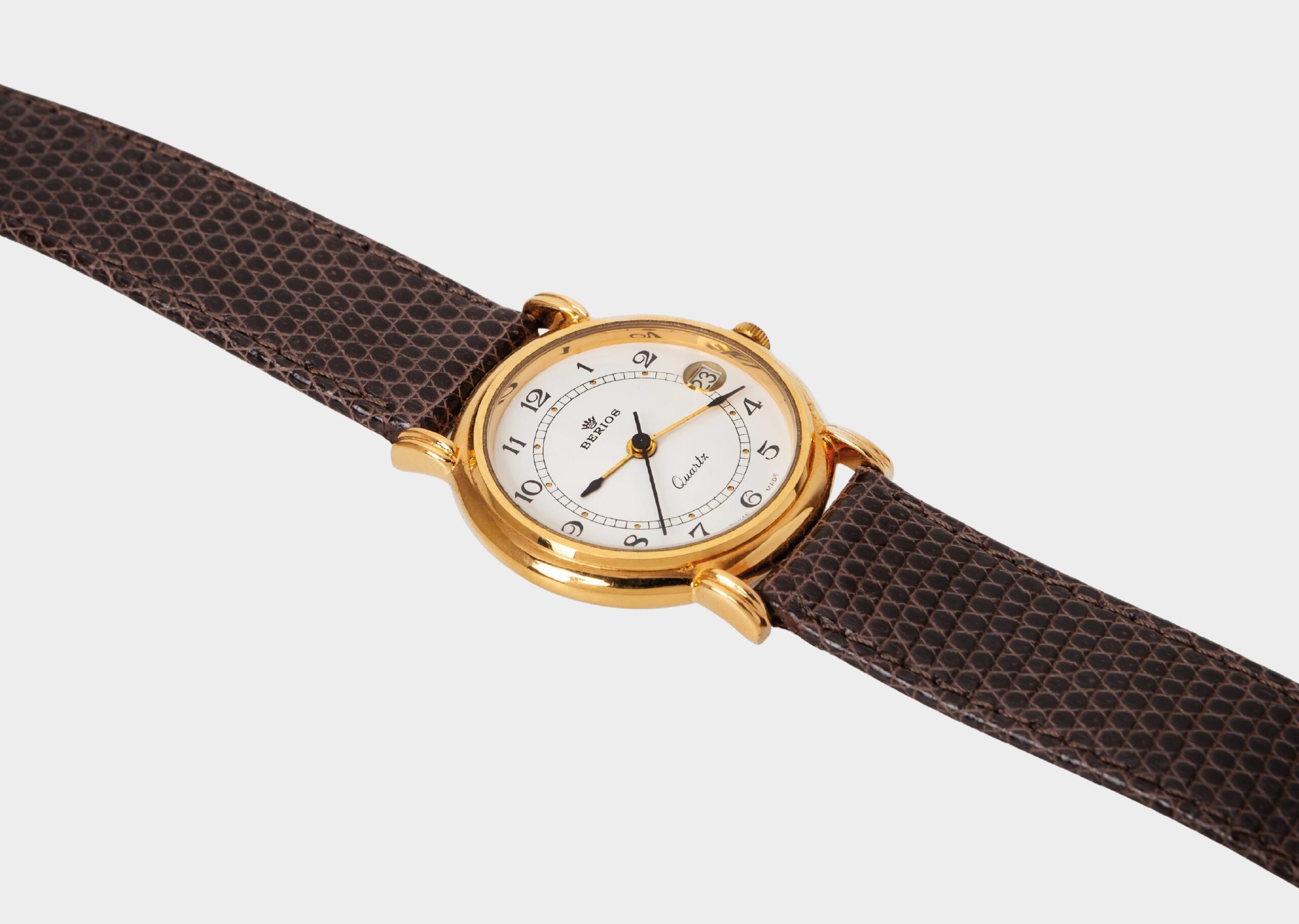 Imperiale – Orologio Berios Vintage Donna è un orologio al quarzo dallo stile classico, con cassa in acciaio da 27 mm e ghiera laminata oro. Il quadrante bianco con numeri eleganti e datario si completa con un cinturino in pelle marrone, per un’eleganza femminile senza tempo.