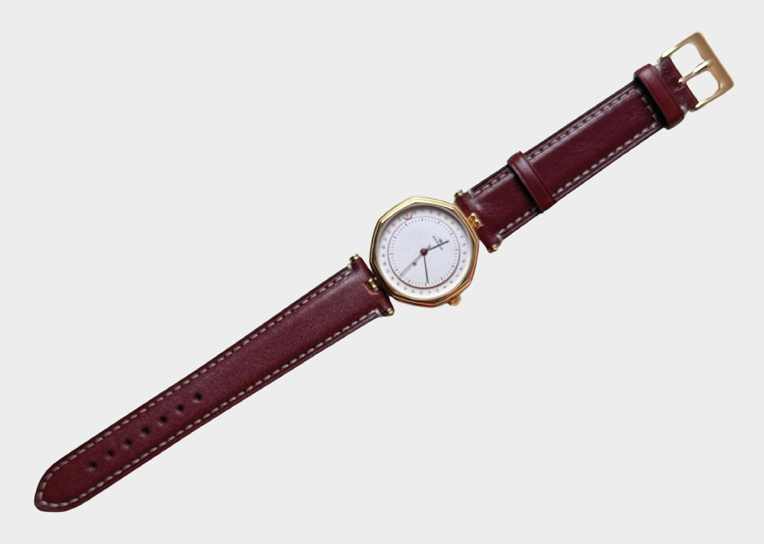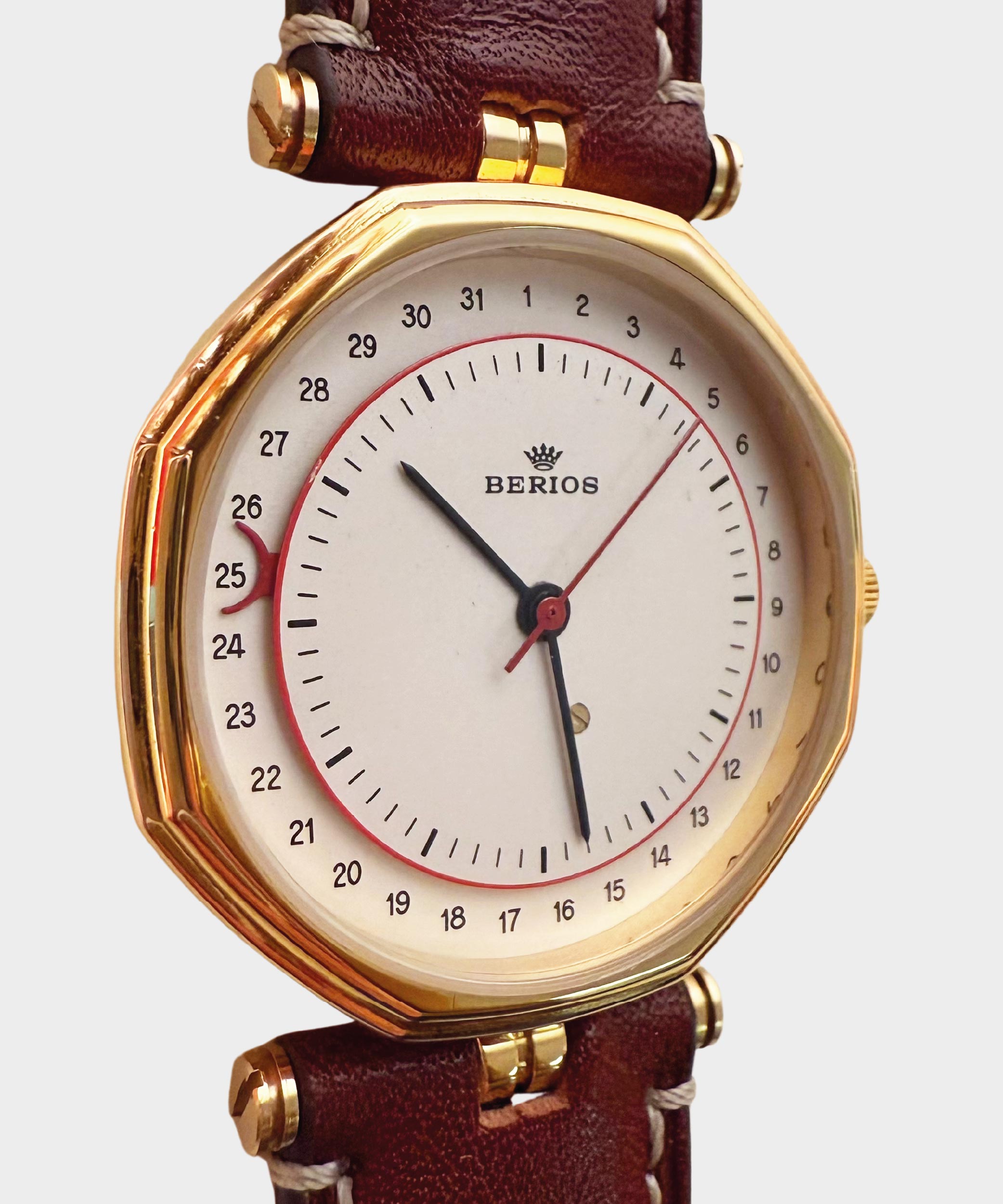 Luna Rossa è un orologio Berios Vintage Watch da uomo al quarzo con cassa ottagonale in acciaio laminato oro da 32×32 mm. Il quadrante bianco presenta dettagli e una luna rossa posizionata al secondo 25, per un design accattivante e contemporaneo.