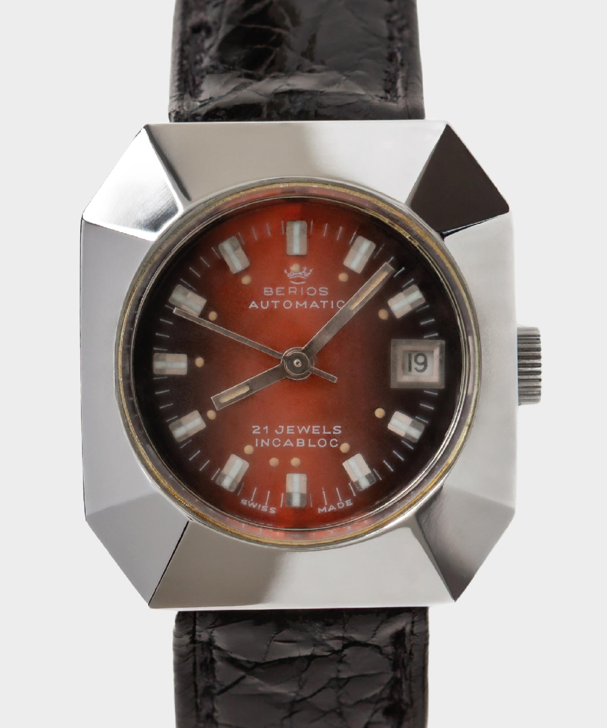 Orange: orologio automatico da donna con cassa ottagonale in acciaio 26×29 mm, quadrante arancione sfumato nero e cinturino in pelle nera. Design elegante e deciso, perfetto per chi ama distinguersi con stile.