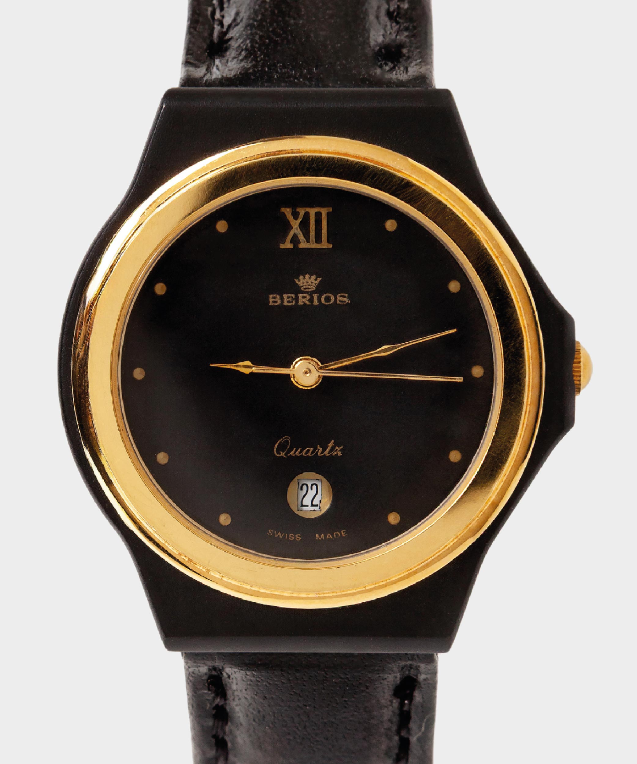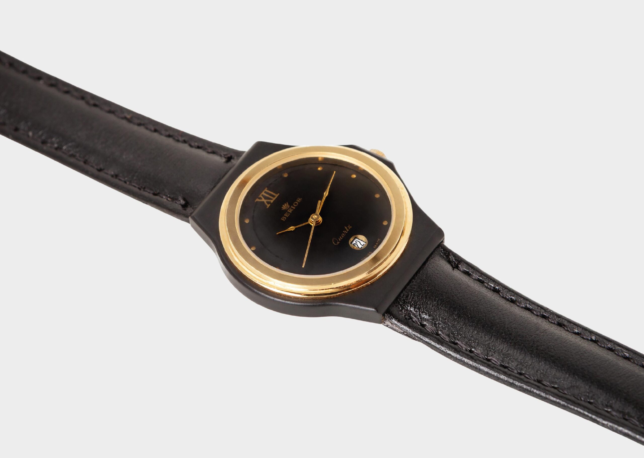 Prestige è un elegante orologio Berios Vintage Watch da donna al quarzo con cassa in acciaio PVD laminata oro e ghiera coordinata. Il quadrante nero con raffinati dettagli dorati esalta uno stile vintage sofisticato, ideale per valorizzare ogni look con classe e precisione.
