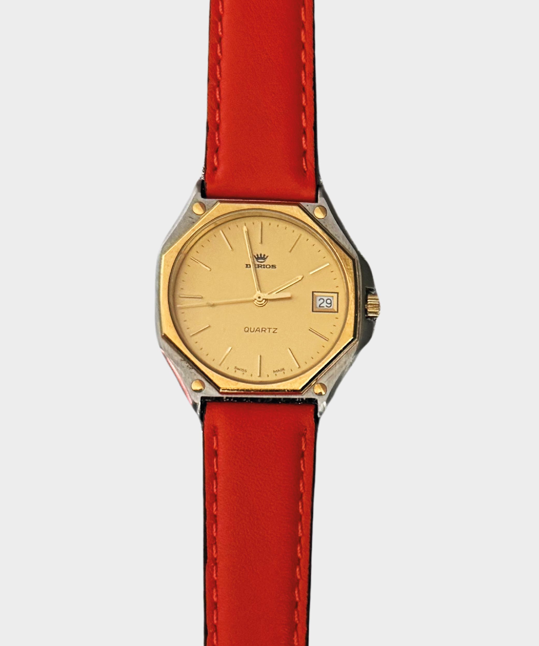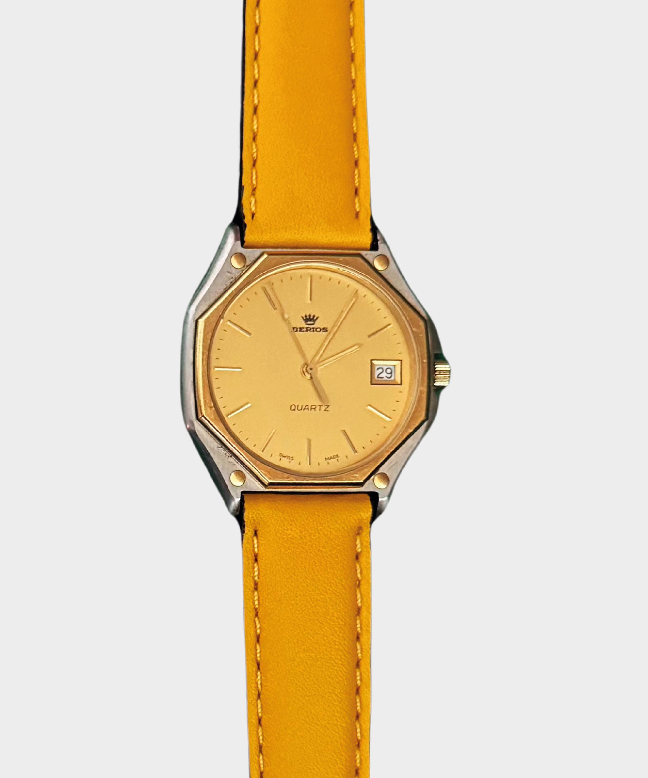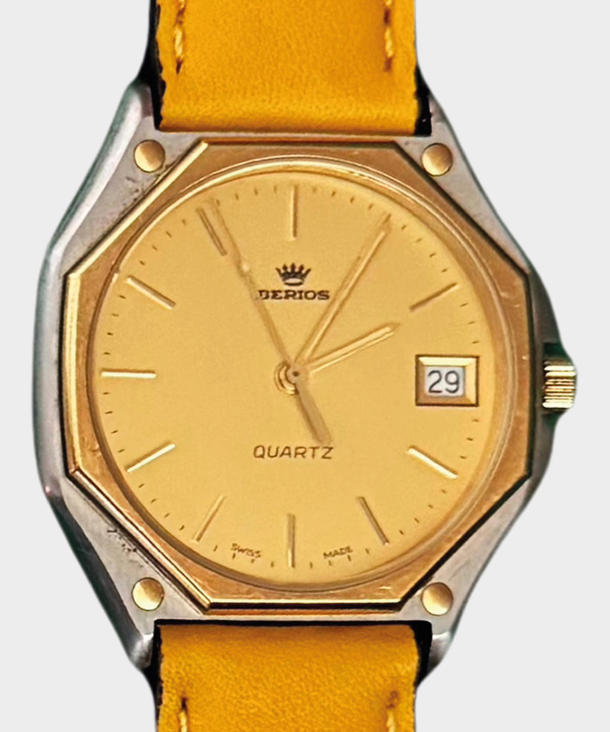 Simbolo Sole è un orologio Berios Vintage Watch da uomo con cassa in acciaio satinato, ghiera oro e cinturino colorato di colore arancione o giallo.